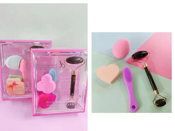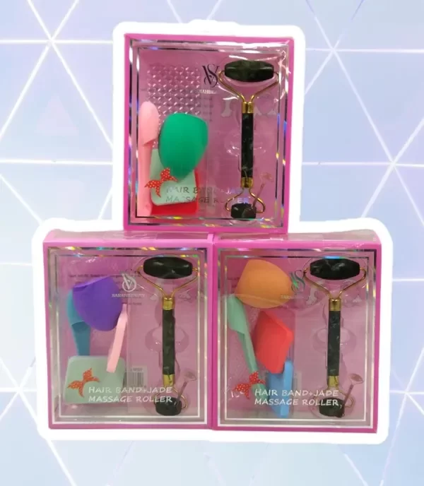 Rodillo de jade para masajes faciales con esponjas y cepillo dedal incluido.